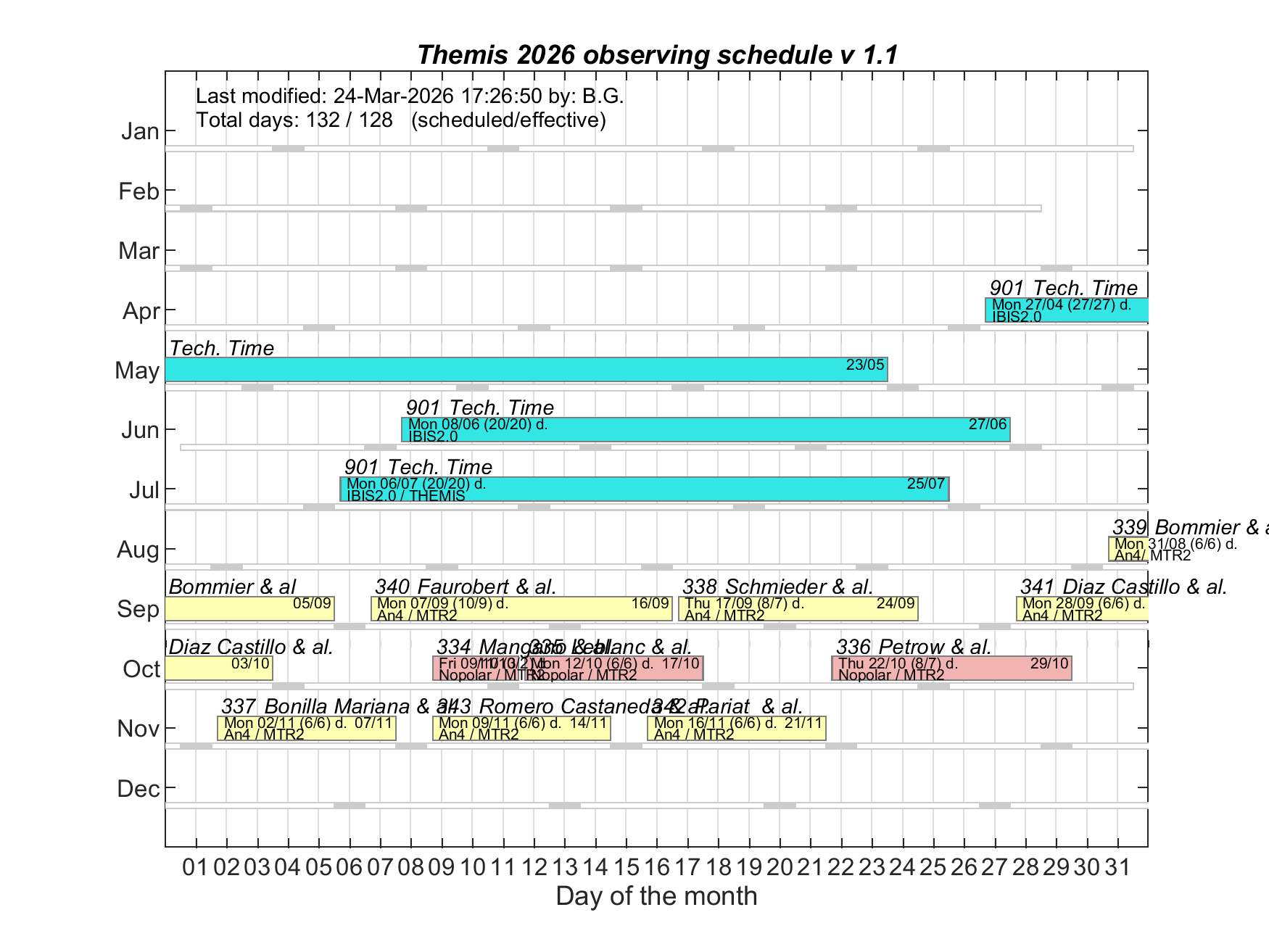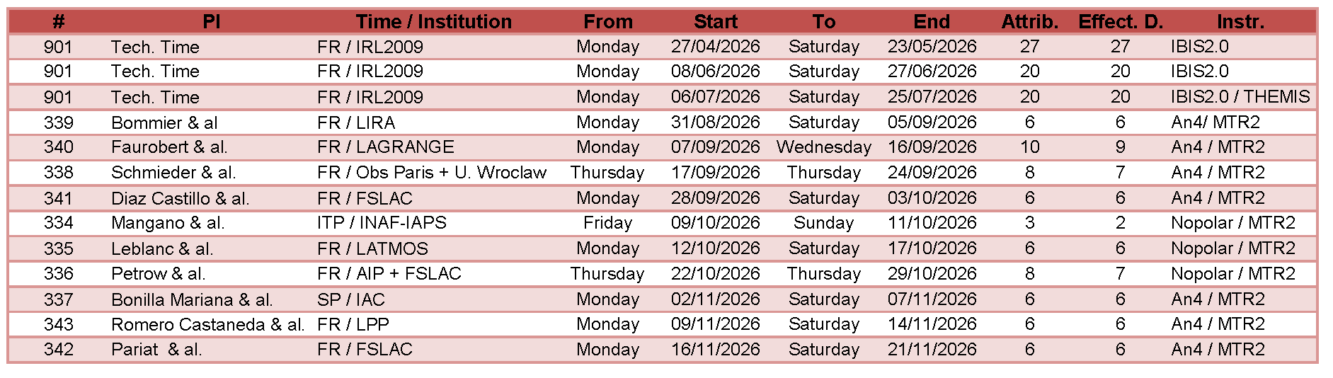 2026 observing campaignThe call for the 2026 observing campaign is now closed! THEMIS 2026 observing campaign will take place approximately from early September to mid-November, 2026, lasting for about 70 days. The 1st half of 2026 shall be mostly dedicated to the on-going installation and commissioning of the Italian IBIS 2.0 spectro-imager. 2026 campaign scheduleThe 2026 campaign shall observe the following schedule: