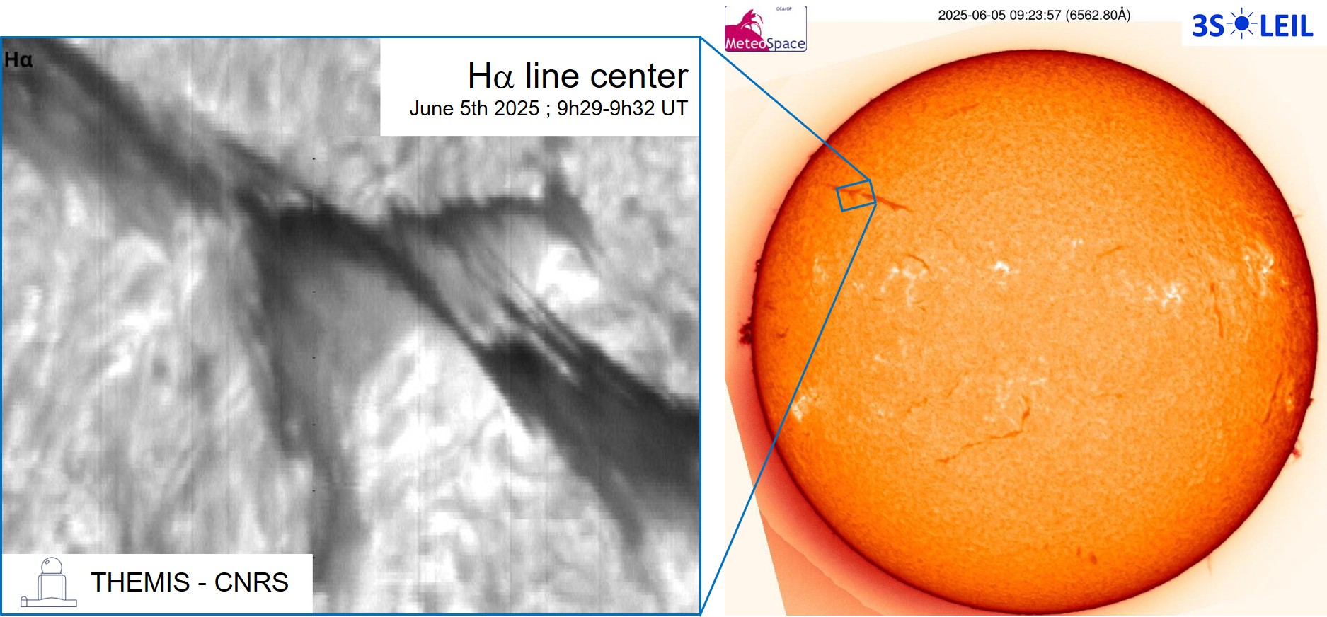 The THEMIS observations, presented in the left panel, results from two reconstructed images obtained from two adjacent scans over the solar filament with the THEMIS spectrograph slit. The two scans, which have a 90“ range with a 0.5” spatial step, are then stitched together to obtain a larger field of view of about 110“x90”. Only the reconstructed image in the core of Hα line is displayed here, but THEMIS data allow to sample the full range of the Hα line with a spectral resolution of 4mÅ.THEMIS high-resolution observations are very complementary to the observations of the Meteospace/3SOLEIL solar surveillance service of OCA/CNRS-INSU, which provide full-Sun high cadence (every 10s) Hα observations, presented on the right panel.