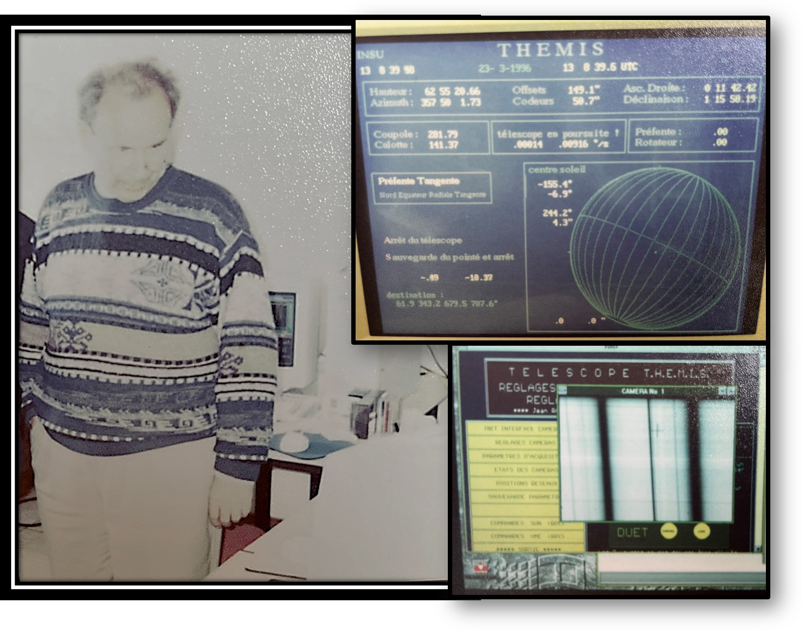 Thirty years ago, in March 1996, THEMIS witnessed its first light. For the first time, THEMIS targeted and tracked the Sun (upper right image of THEMIS tracking software, still in used today). THEMIS long-slit spectrograph acquired its first solar spectral images (bottom right image). This key moment was a pivotal point marking the transition of the end of the development of the project toward the start of its scientific exploitation. It crowned a twenty year effort, which started in the middle of the 1970's, for the construction of what is still the largest French solar telescope, and one of the world-largest one. The construction and design of the THEMIS telescope was led by J. Rayrole (picture on the left taken for the 1st light) along with P. Mein and M. Semel, the three “founding fathers” of THEMIS. |