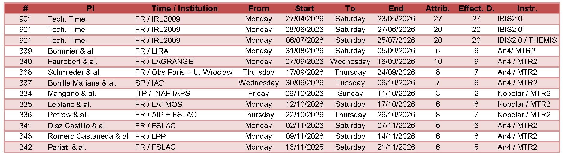 As soon as the appropriate proposal refereeing procedures of each community and TAC have been passed, applicants shall quickly be informed of their application outcomes. During the spring of 2026, the integration of IBIS 2.0 being scheduled only a limited observation slots are possible. Users requiring observation time during this period shall provide specific justifications based on strong scientific arguments.